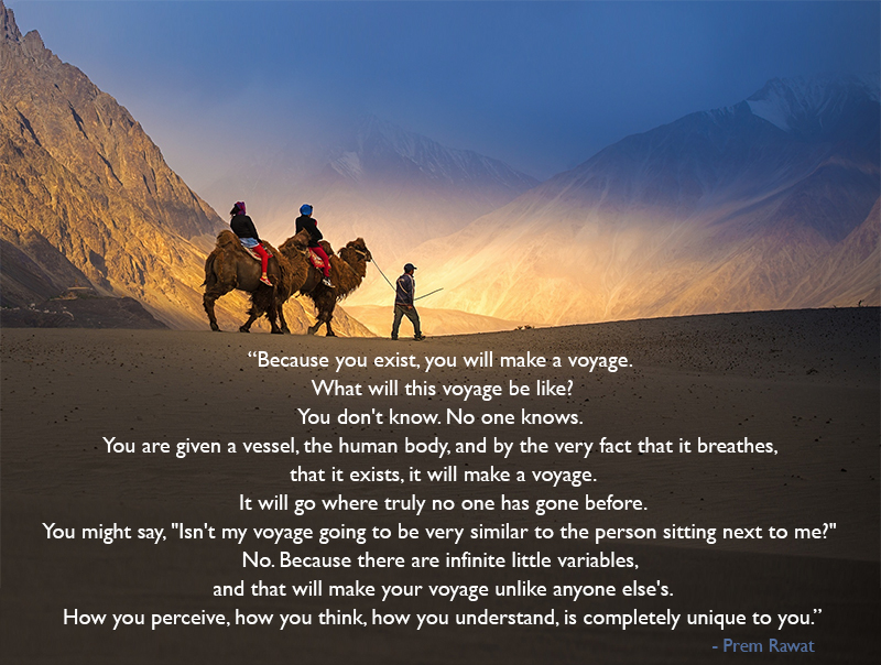 Because you exist, you will make a voyage. What will this voyage be like? You don't know. No one knows. You are given a vessel, the human body, and by the very fact that it breathes, that it exists, it will make a voyage. It will go where truly no one has gone before. You might say, "Isn't my voyage going to be very similar to the person sitting next to me?" No. Because there are infinite little variables, and that will make your voyage unlike anyone else's. How you perceive, how you think, how you understand, is completely unique to you.”