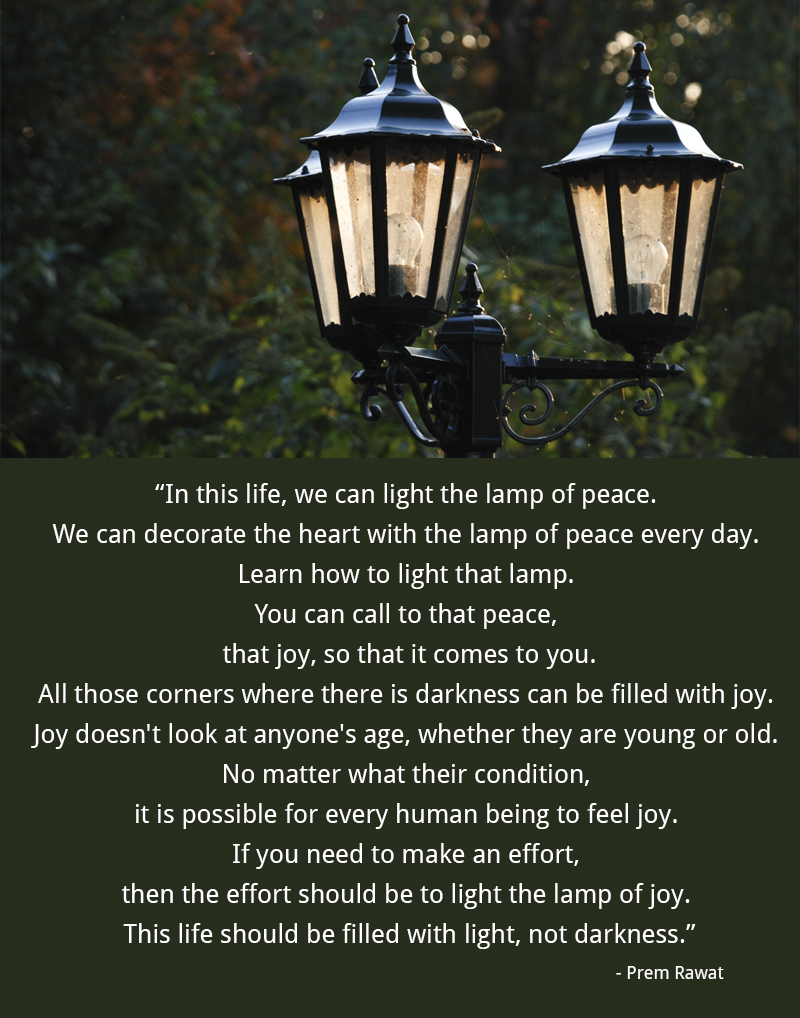 In this life, we can light the lamp of peace. We can decorate the heart with the lamp of peace every day. Learn how to light that lamp. You can call to that peace, that joy, so that it comes to you. All those corners where there is darkness can be filled with joy. Joy doesn't look at anyone's age, whether they are young or old. No matter what their condition, it is possible for every human being to feel joy. If you need to make an effort, then the effort should be to light the lamp of joy. This life should be filled with light, not darkness.