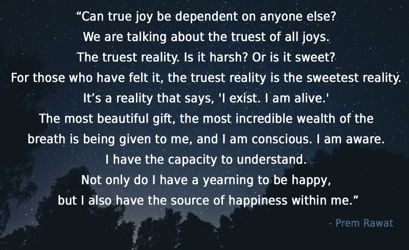 Can true joy be dependent on anyone else? We are talking about the truest of all joys. The truest reality. Is it harsh? Or is it sweet? For those who have felt it, the truest reality is the sweetest reality. It’s a reality that says, 'I exist. I am alive.' The most beautiful gift, the most incredible wealth of the breath is being given to me, and I am conscious. I am aware. I have the capacity to understand. Not only do I have a yearning to be happy, but I also have the source of happiness within me.