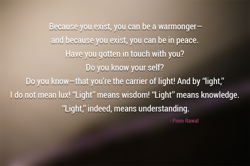 Because you exist, you can be a warmonger— and because you exist, you can be in peace. Have you gotten in touch with you? Do you know your self? Do you know—that you’re the carrier of light! And by “light,” I do not mean lux! “Light” means wisdom! “Light” means knowledge. “Light,” indeed, means understanding.