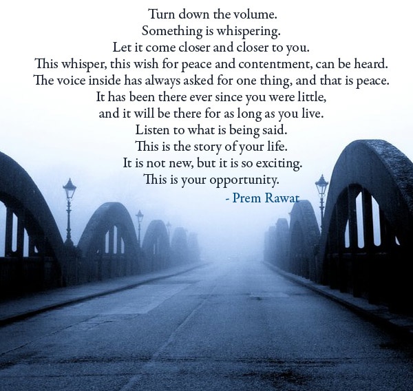 Turn down the volume. Something is whispering. Let it come closer and closer to you. This whisper, this wish for peace and contentment, can be heard. The voice inside has always asked for one thing, and that is peace. It has been there ever since you were little, and it will be there for as long as you live. Listen to what is being said. This is the story of your life. It is not new, but it is so exciting. This is your opportunity.