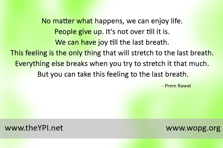 No matter what happens, we can enjoy life. People give up. It's not over till it is. We can have joy till the last breath. This feeling is the only thing that will stretch to the last breath. Everything else breaks when you try to stretch it that much. But you can take this feeling to the last breath.