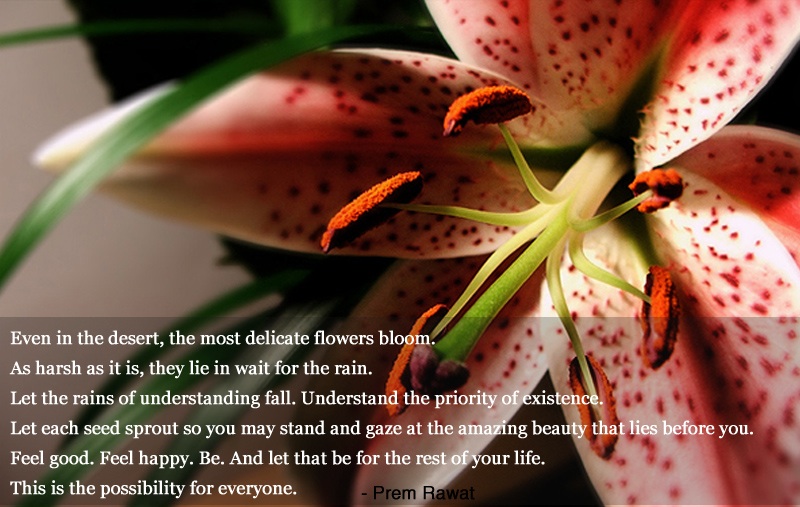 Even in the desert, the most delicate flowers bloom. As harsh as it is, they lie in wait for the rain. Let the rains of understanding fall. Understand the priority of existence. Let each seed sprout so you may stand and gaze at the amazing beauty that lies before you. Feel good. Feel happy. Be. And let that be for the rest of your life. This is the possibility for everyone.