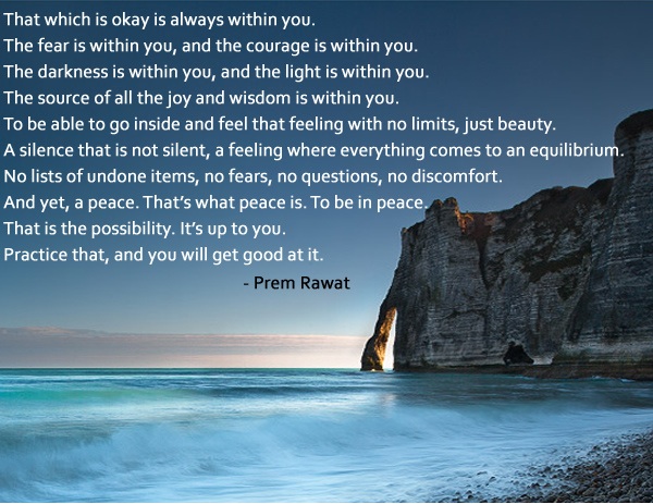 That which is okay is always within you. The fear is within you, and the courage is within you. The darkness is within you, and the light is within you. The source of all the joy and wisdom is within you. To be able to go inside and feel that feeling with no limits, just beauty. A silence that is not silent, a feeling where everything comes to an equilibrium. No lists of undone items, no fears, no questions, no discomfort. And yet, a peace. That’s what peace is. To be in peace. That is the possibility. It’s up to you. Practice that, and you will get good at it.