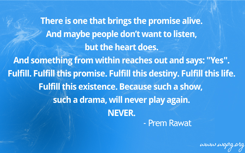 There is one that brings the promise alive. And maybe people don’t want to listen, but the heart does. And something from within reaches out and says: "Yes". Fulfill. Fulfill this promise. Fulfill this destiny. Fulfill this life. Fulfill this existence. Because such a show, such a drama, will never play again. NEVER.